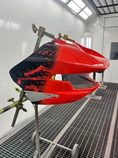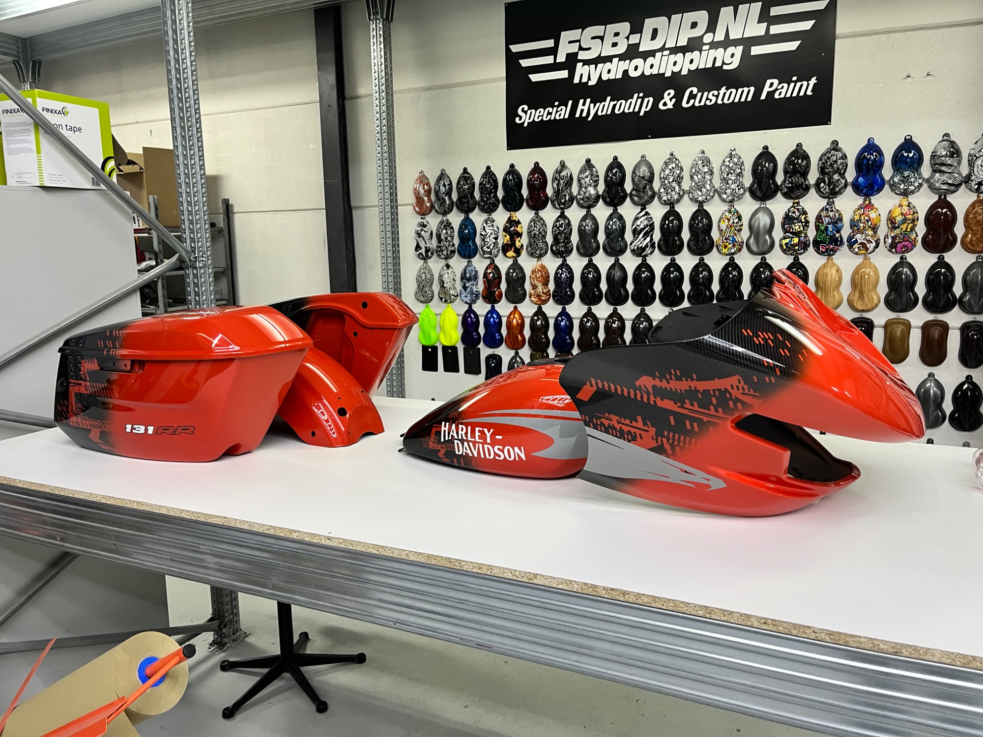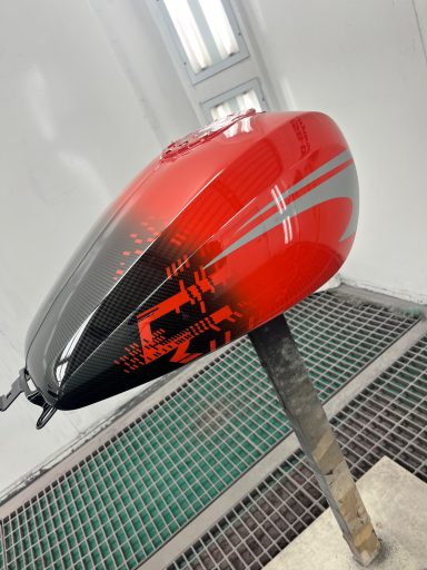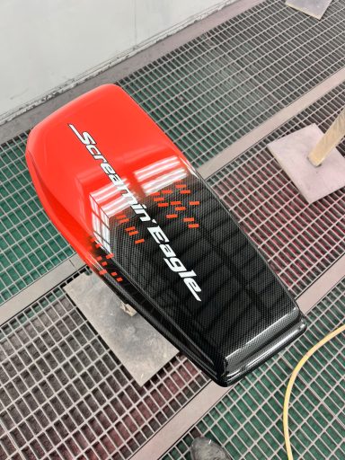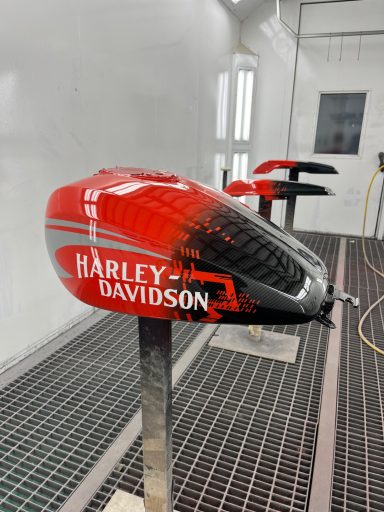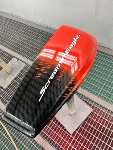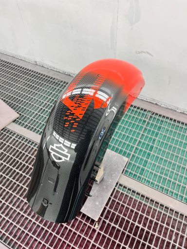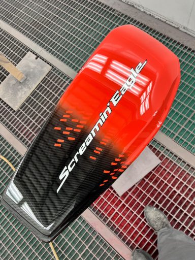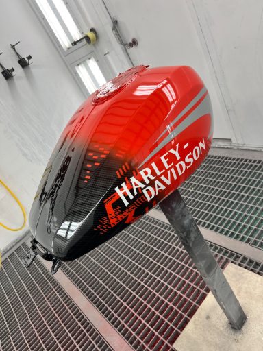 In opdracht voor de Harley-Davidson dealer hebben wij deze CVO na gemaakt van af de originele racer die in Amerika geleverd is. Deze is eerst volledig carbon gehydrodipt en daarna is alles in gespoten door ons.