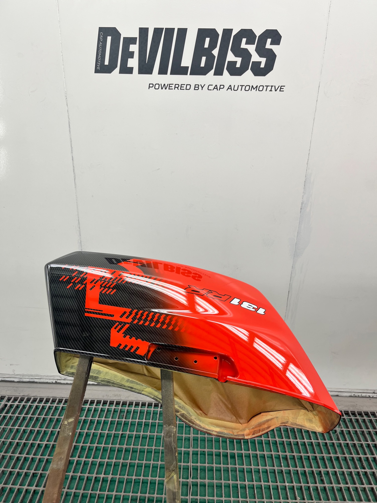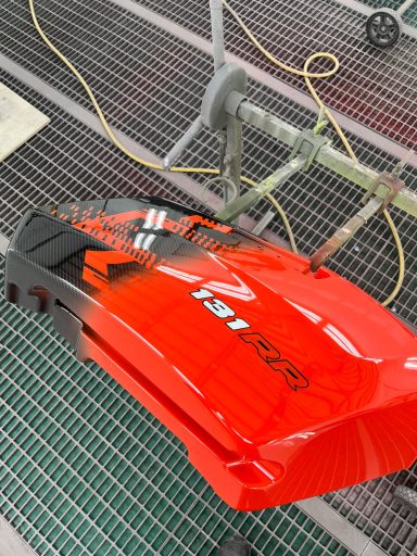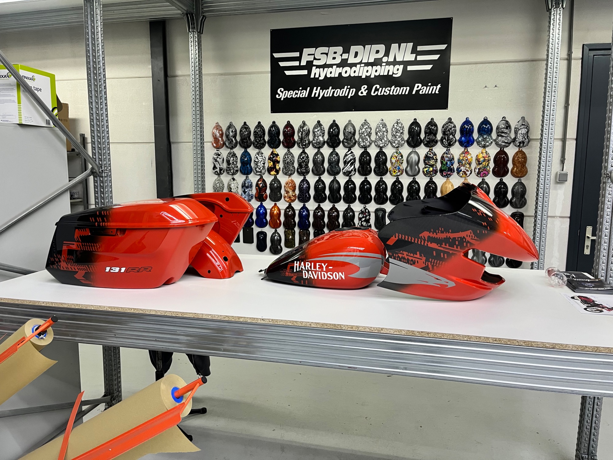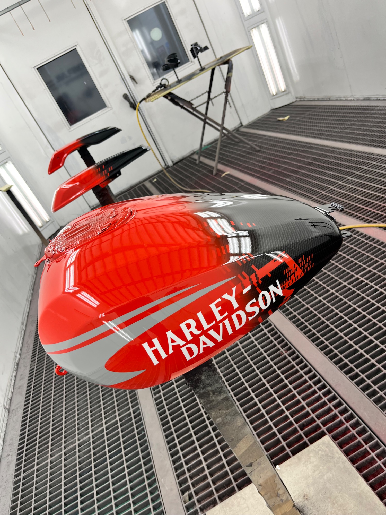 In opdracht voor de Harley-Davidson dealer hebben wij deze CVO na gemaakt van af de originele racer die in Amerika geleverd is. Deze is eerst volledig carbon gehydrodipt en daarna is alles in gespoten door ons.
